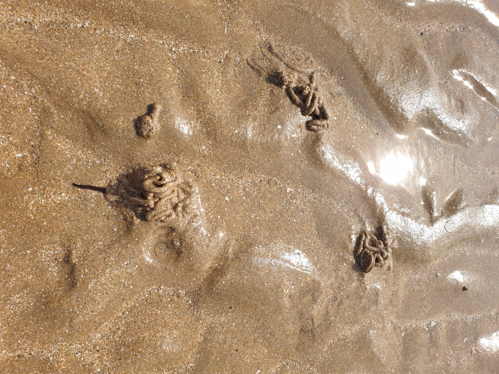 Lugworms” or “Arenicolidae” can be found on sandy beachea and mud flats. They leave a sand cast on top of their burrow which shows where they are.