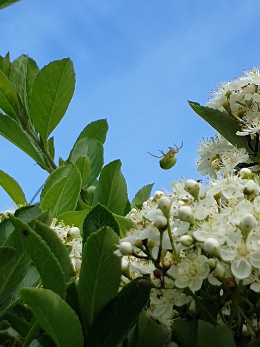 In the Garden this evening (Bit later with writing the blog post today), came across a Green Orb-Spider (Araniella cucurbitina) busy between the leaves on my Pyrocantha also called Fire Thorn hedge.