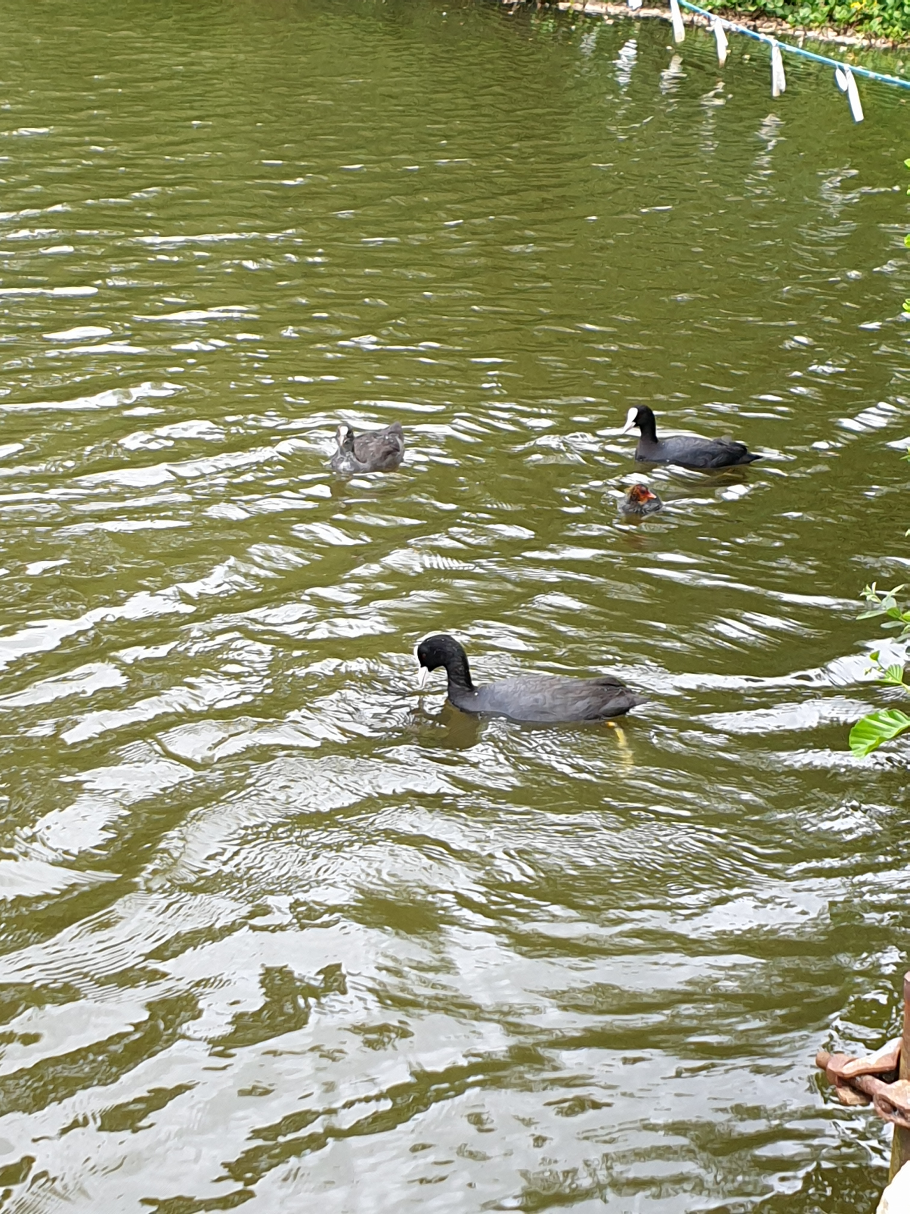 Sitting at the fishing lake today, a family of Coots (Fulica atra) were swimming around. The family were, mum, dad, juvenile and a baby.