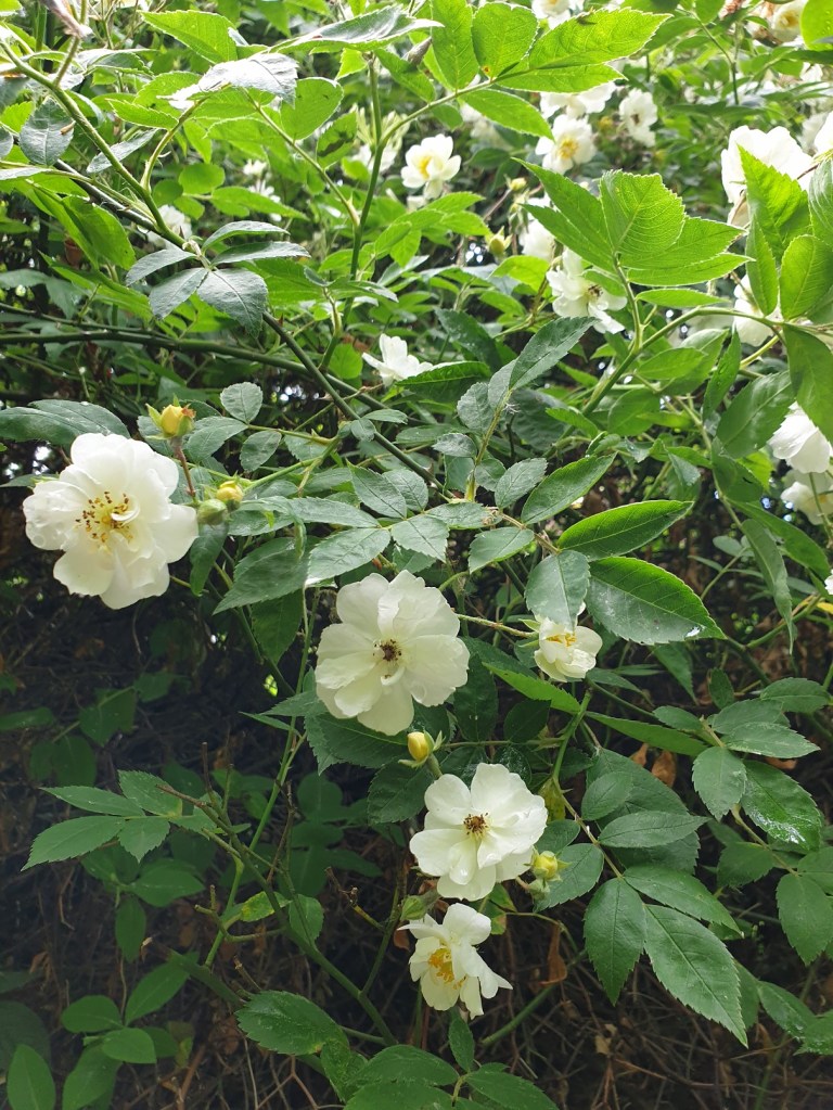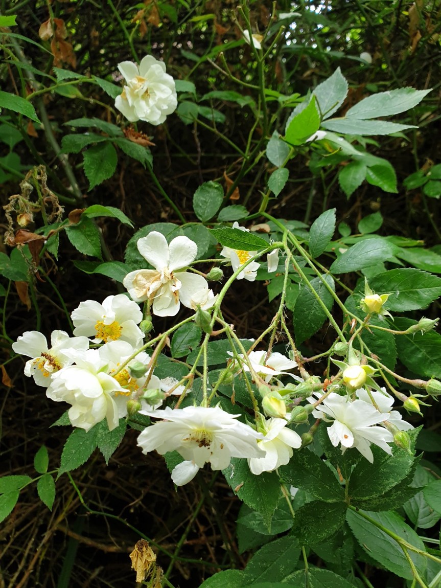The rose climbs and winds through hedgerows. In a garden it needs something to grow against. Growing anywhere between 1 and 5 meters and like other roses, the stems are covered with thorns. The thorns help to provide grip and hold against and aid its climb.